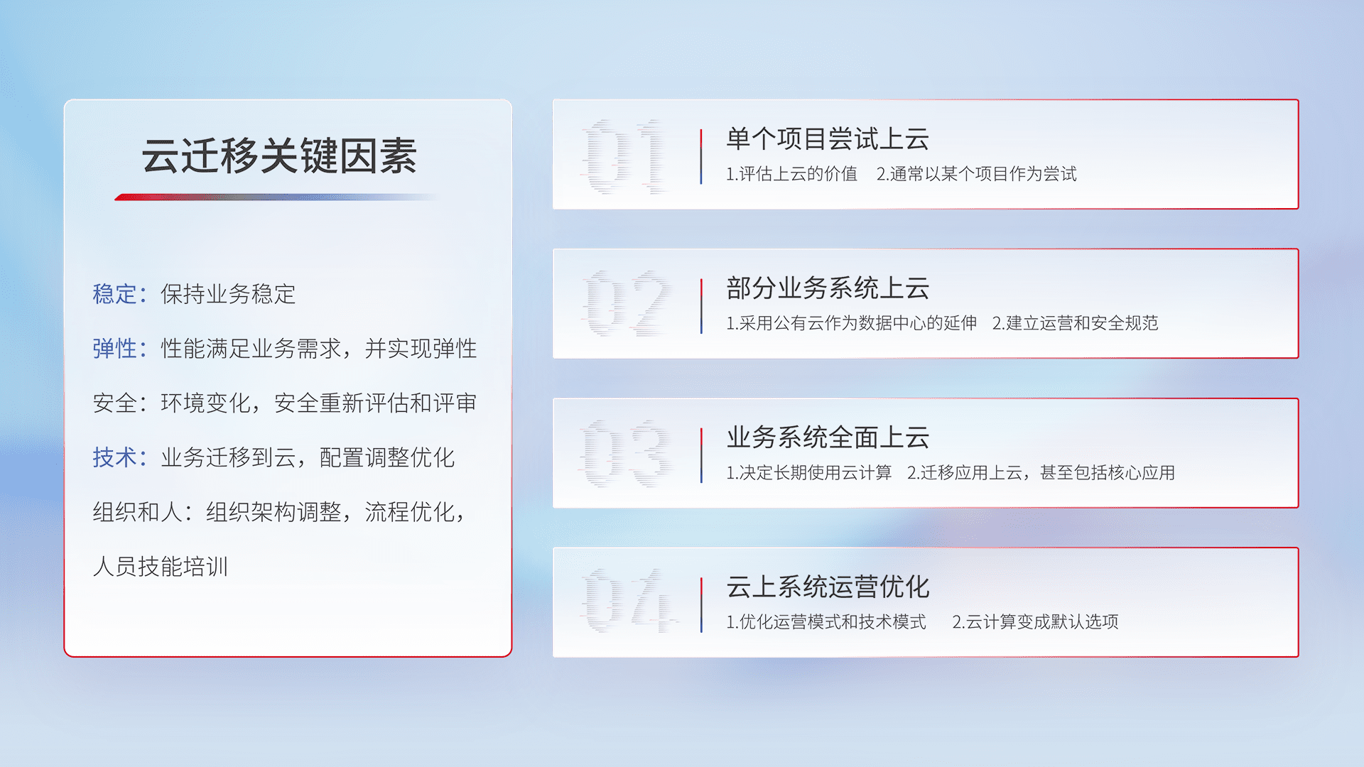 结合实际业务,,从规划设计、、云平台选型、、、、云原生改造、、、、数据迁移、、集成交付,,,迁移全过程为客户识别最佳上云路径,,做好风险识别管理,,,设计网络架构、、、身份权限、、、安全审计合规、、、操作审计、、、、日志审计、、、监控告警策略、、、、多站点容灾设计等,,,对云上基础设施进行整体规划,,提升IT治理水平,,以满足弹性、、、高可用、、高性能的需求。。。。